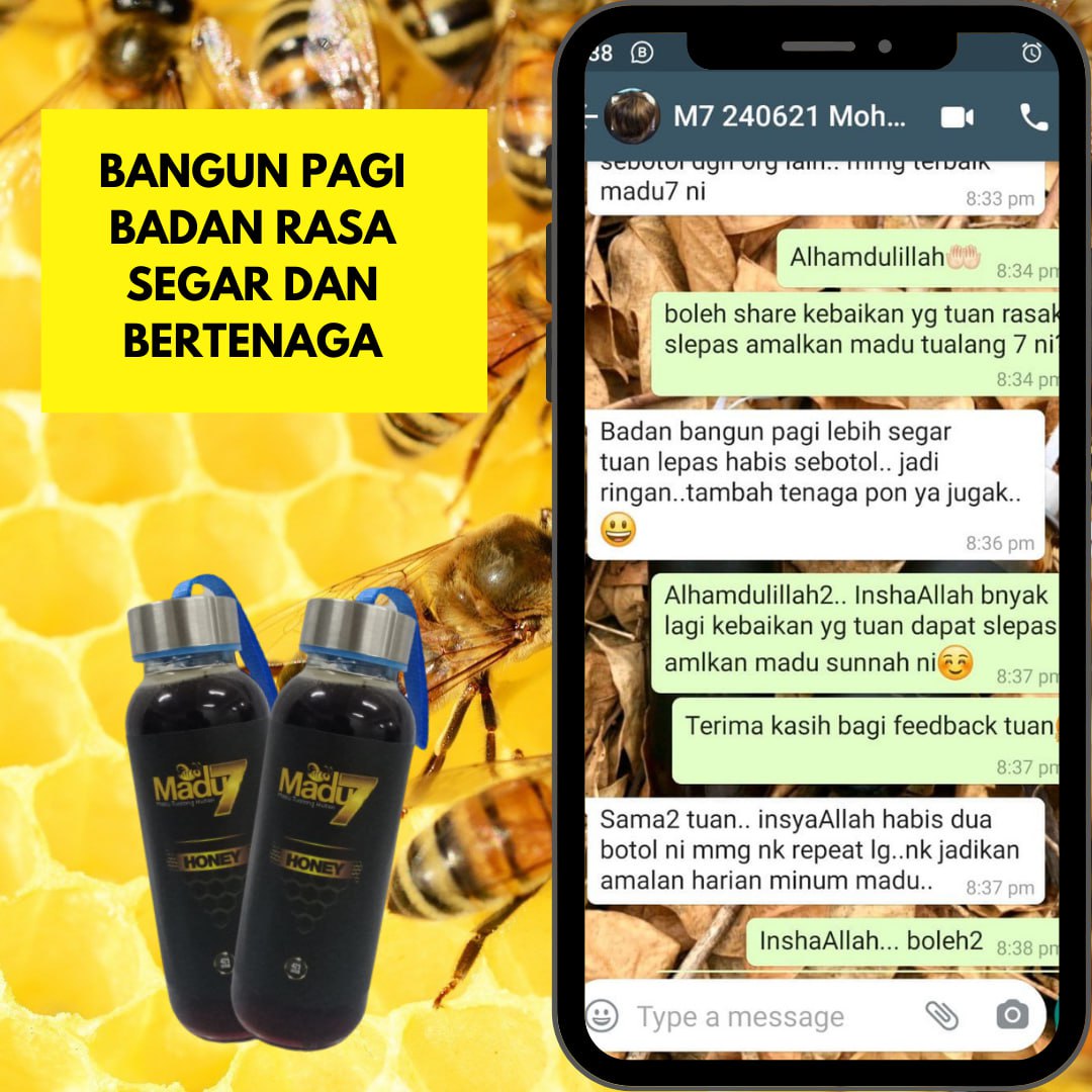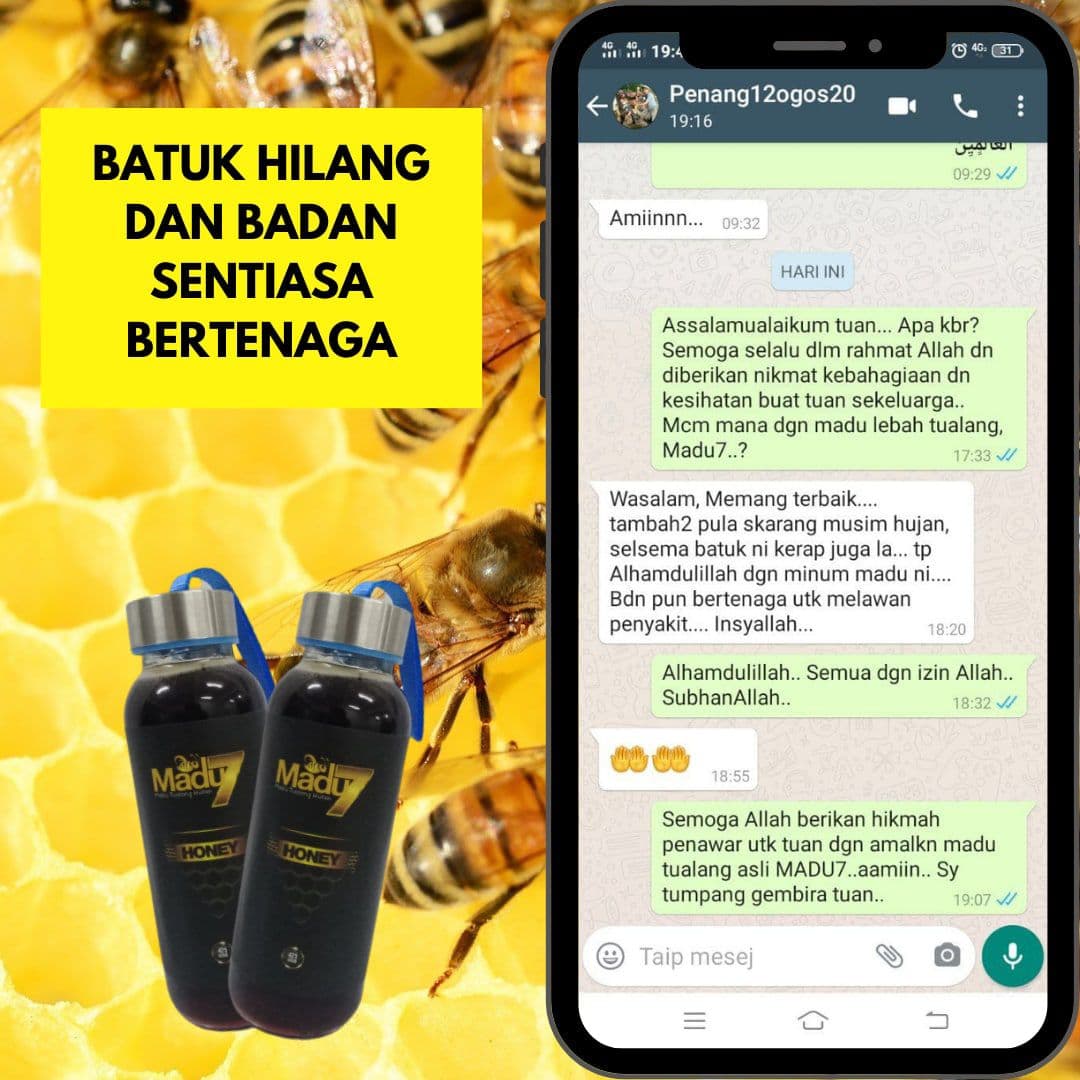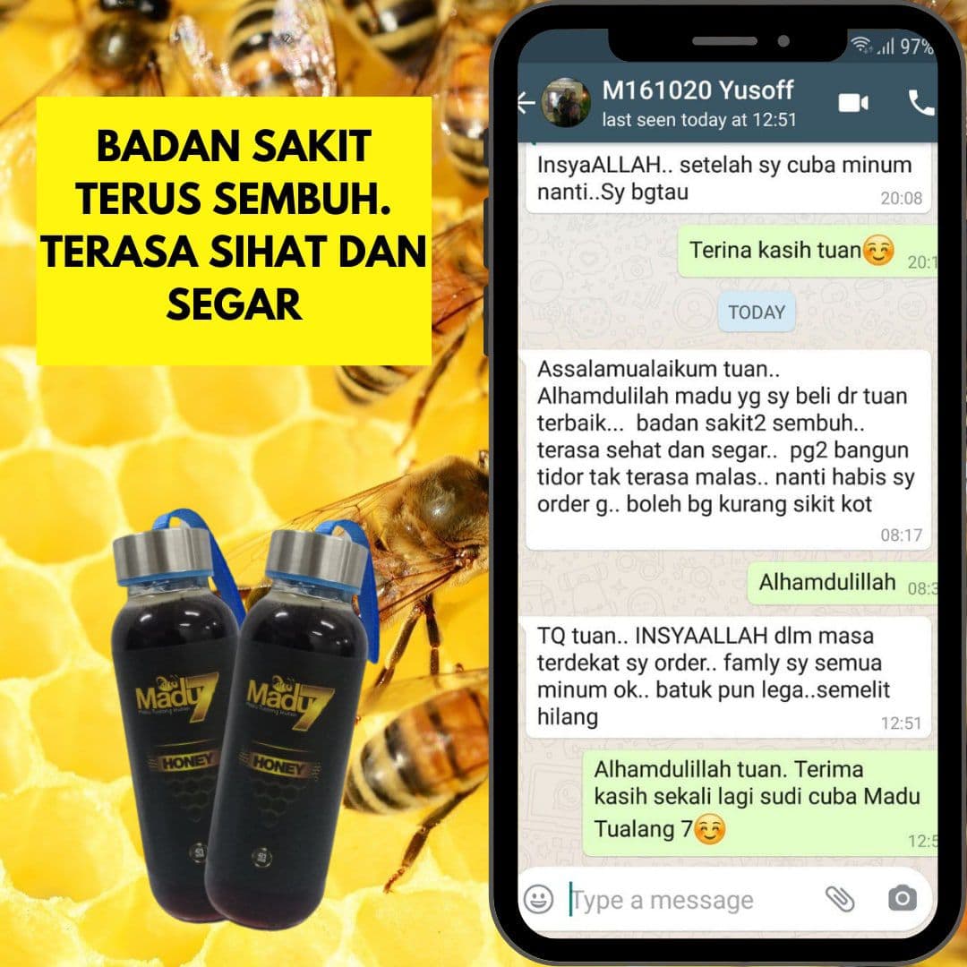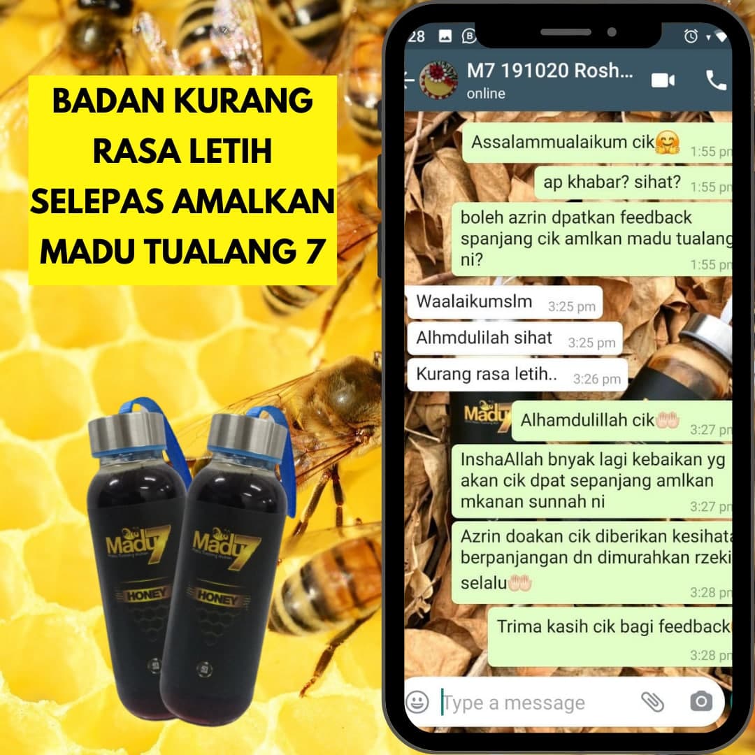 Dengan mengamalkan secara konsisten 2 sudu Madu Tualang 7 setiap malam sebelum tidur dapat menambahkan tenaga dan menyelesaikan masalah lemah tenaga batin ketika bersama dengan pasangan.